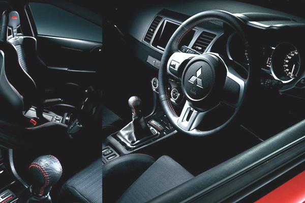 Based on the Evo-GSR trim, Lancer with 5-speed manual shift receives blackened front grille with garnish of chrome, 18-inch BBS alloy wheels, suspension bits from Bilstein and Eibach, brakes are sourced from the famous Brembo. Lower bumpers and model emblems covered in the gloss black shade contrast the whole deal.